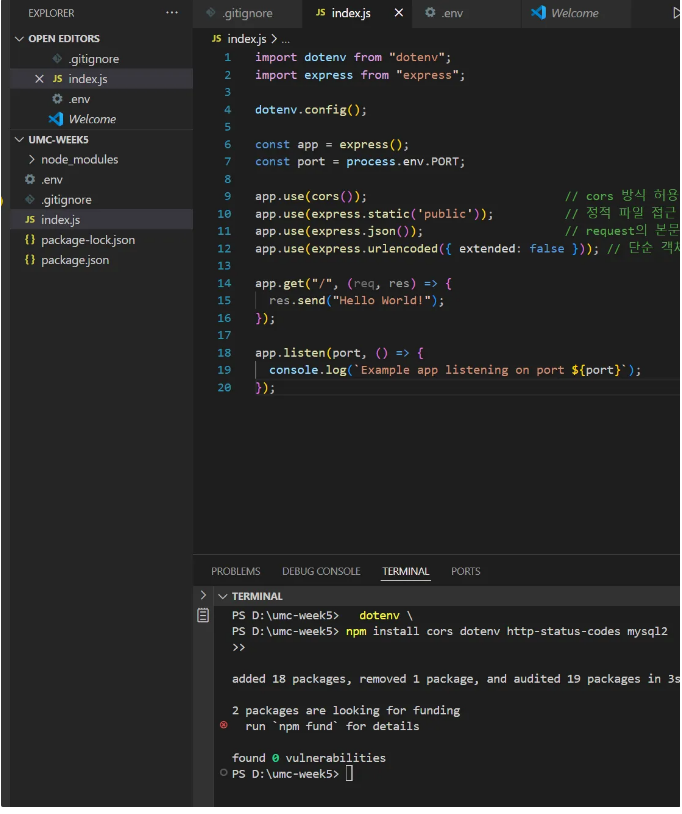 2. 또한 index.js 파일에 3000 포트로 서버 포트가 구성되지만, 앞으로는 환경 변수를 통해 변경할 수 있도록 하기 위해서, index.js 파일을 다음과 같이 수정해주었습니다.