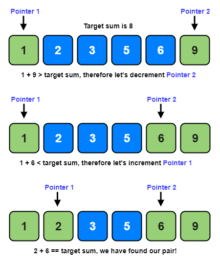 1차원 배열에서 각자 다른 원소를 가리키고 있는 2개의 포인터를 조작해가면서 원하는 값을 찾을 때 까지 탐색하는 알고리즘