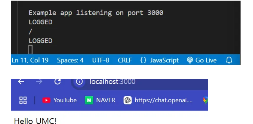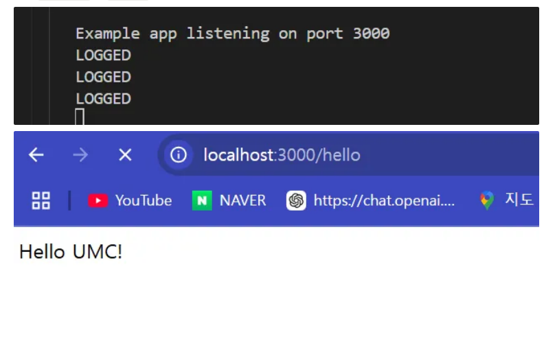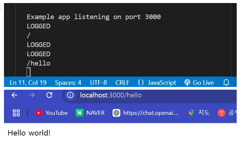 - next()를 제거하면 myLogger 미들웨어가 호출된 후, /나 /hello 경로에 대한 응답이 클라이언트로 전송되지 않고 중단된다.
