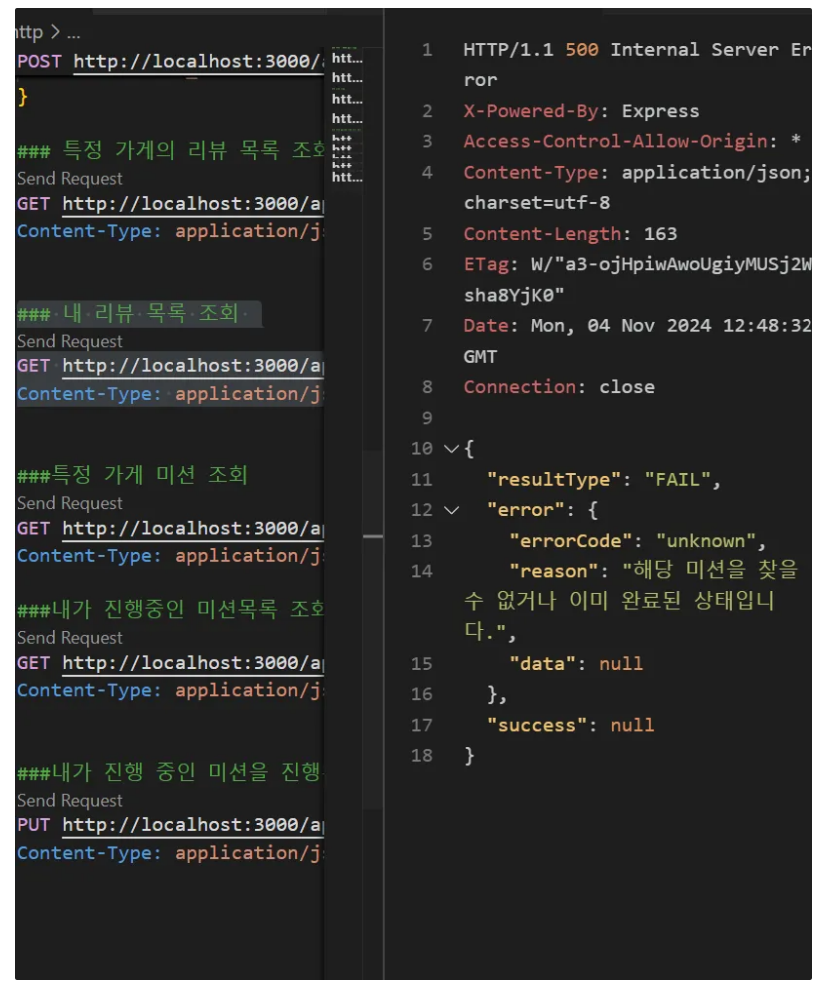 **throw new MissionNotFoundError('해당 미션을 찾을 수 없거나 이미 완료된 상태입니다.', { userId, missionId });**