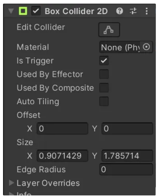 - Box Colider 2d를 추가해준 다음 영역을 설정해준다.