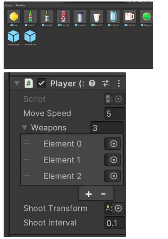 - weapon을 배열로 수정한다음 player에 추가해준다