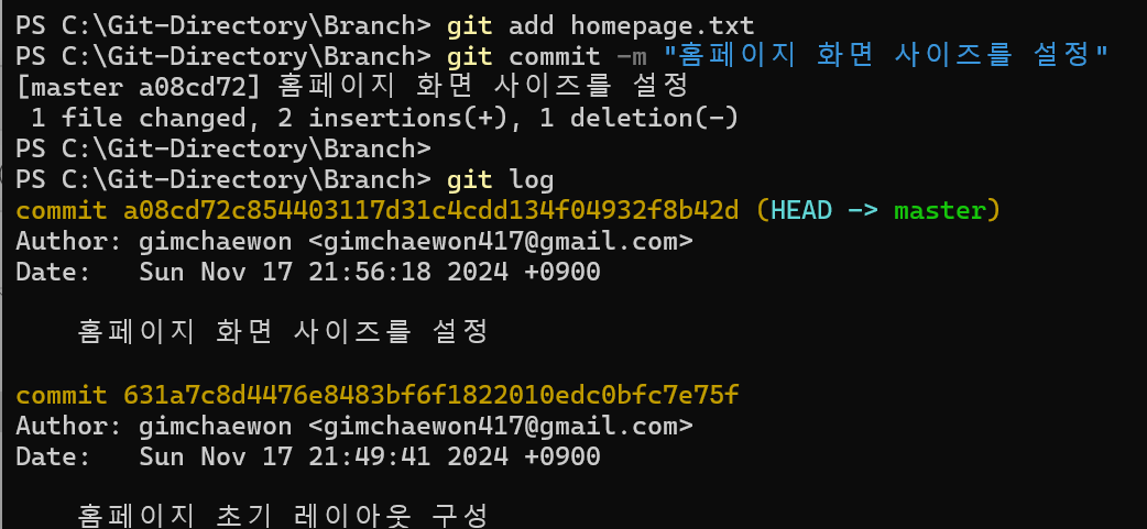 💠 그 다음 git init 명령어를 입력해 Git이 관찰할 수 있는 상태로 만듭니다. 또한 초기 커밋을 진행하기 위해 Branch1 디렉터리에서 다음과 같이 homepage.txt 파일을 만들어서 저장합니다.
