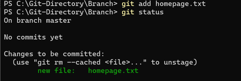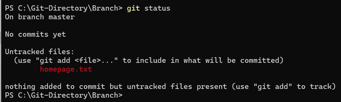 💠 그 다음 현재 상태를 확인하는 git status 명령어를 실행합니다. 그럼 homepage.txt가 빨간색 글씨로 표현되는 데 이는 아직 스테이징 영역에 넣지 않았기 때문에 발생하는 오류 입니다.