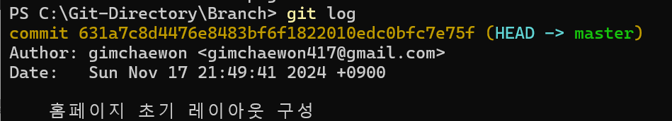 💠그 다음 git branch와 git log를 실행해서 어떻게 변화했는지 확인해봅니다.