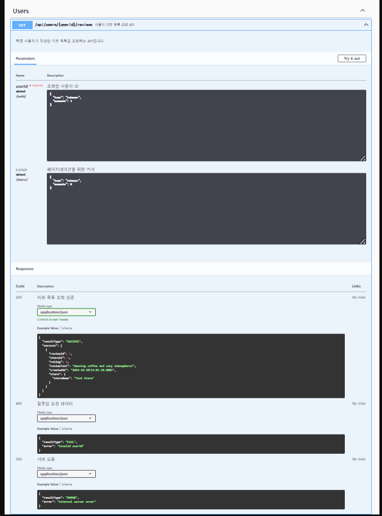 #swagger.summary = '사용자 리뷰 목록 조회 API';