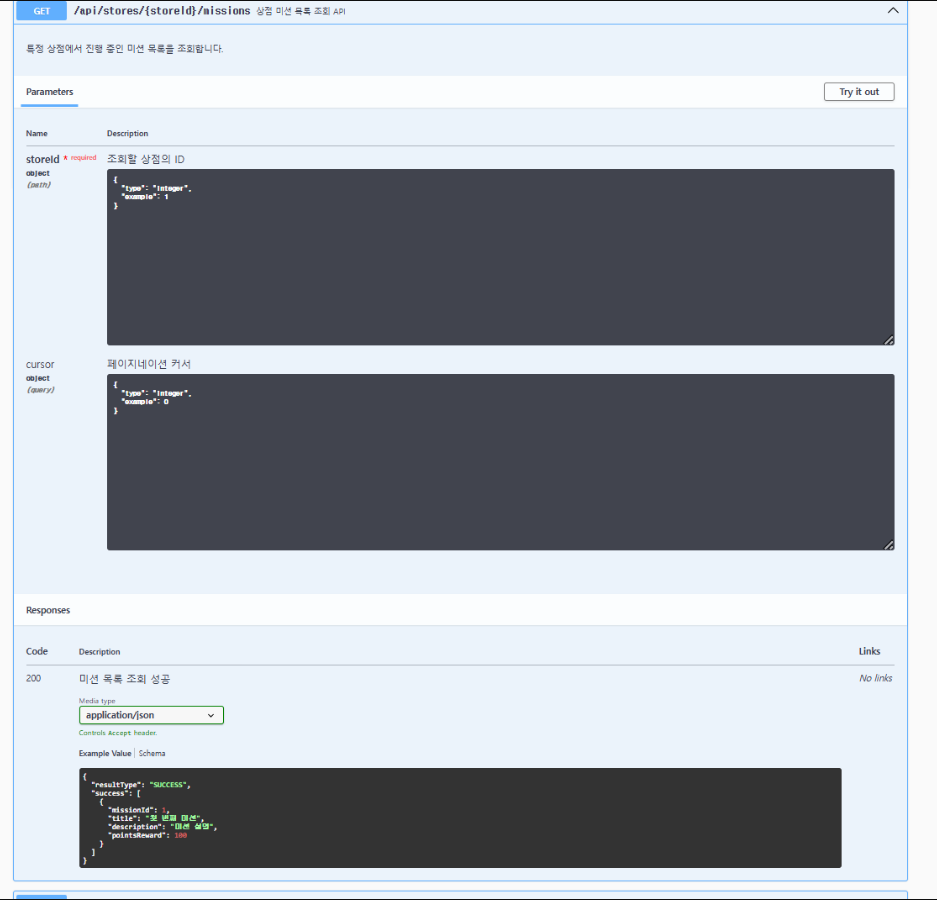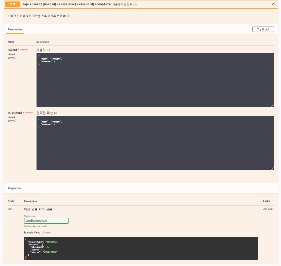 missionId: { type: "integer", description: "미션 ID", example: 1 },