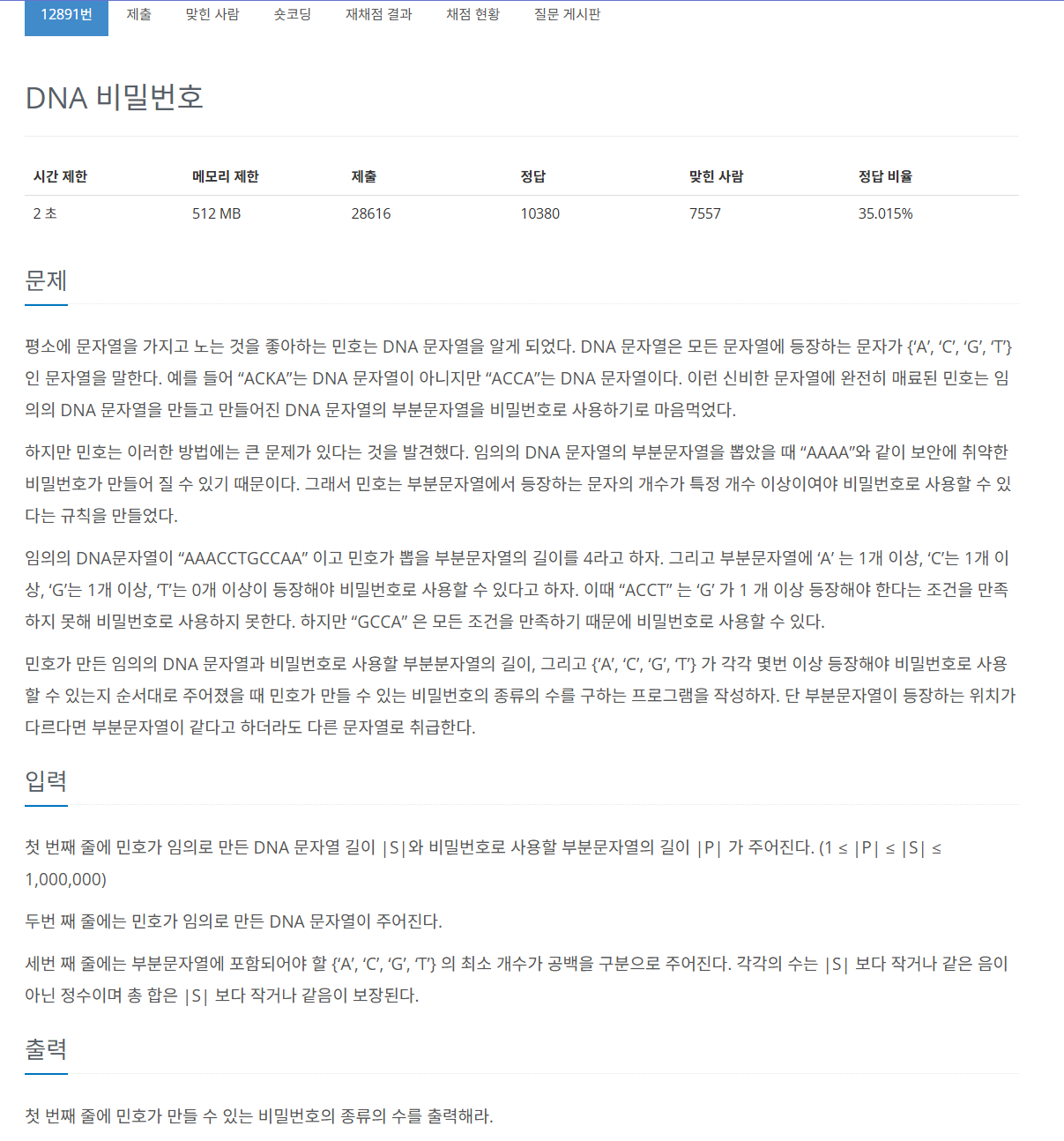 myArr = new int[4]; //현재 상태 배열 (a,c,g,t가 얼만큼 있는지 체크 )