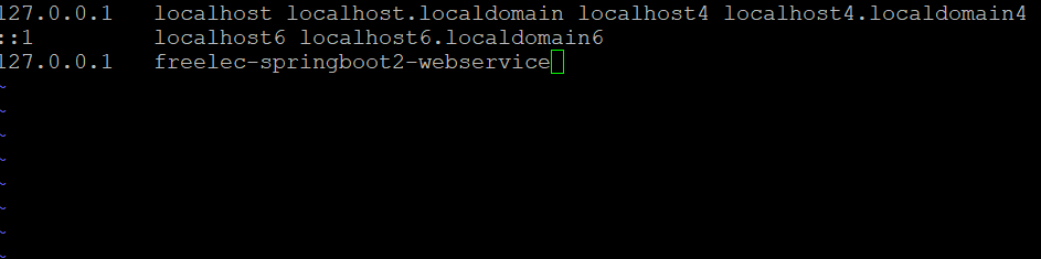그 다음 다음 명령어로 /etc/hosts 파일을 열어 다음과 같은 화면에 등록한 호스트네임을 등록한다