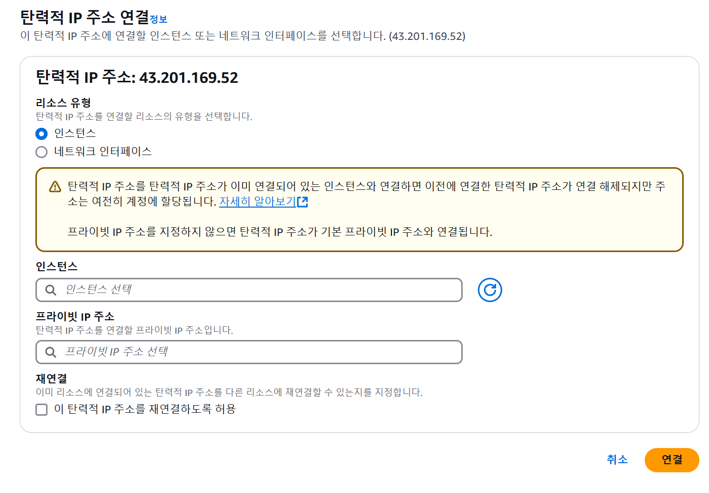 주소 연결을 위해 생성한 EC2 이름과 IP를 선택하고 연결하면 된다