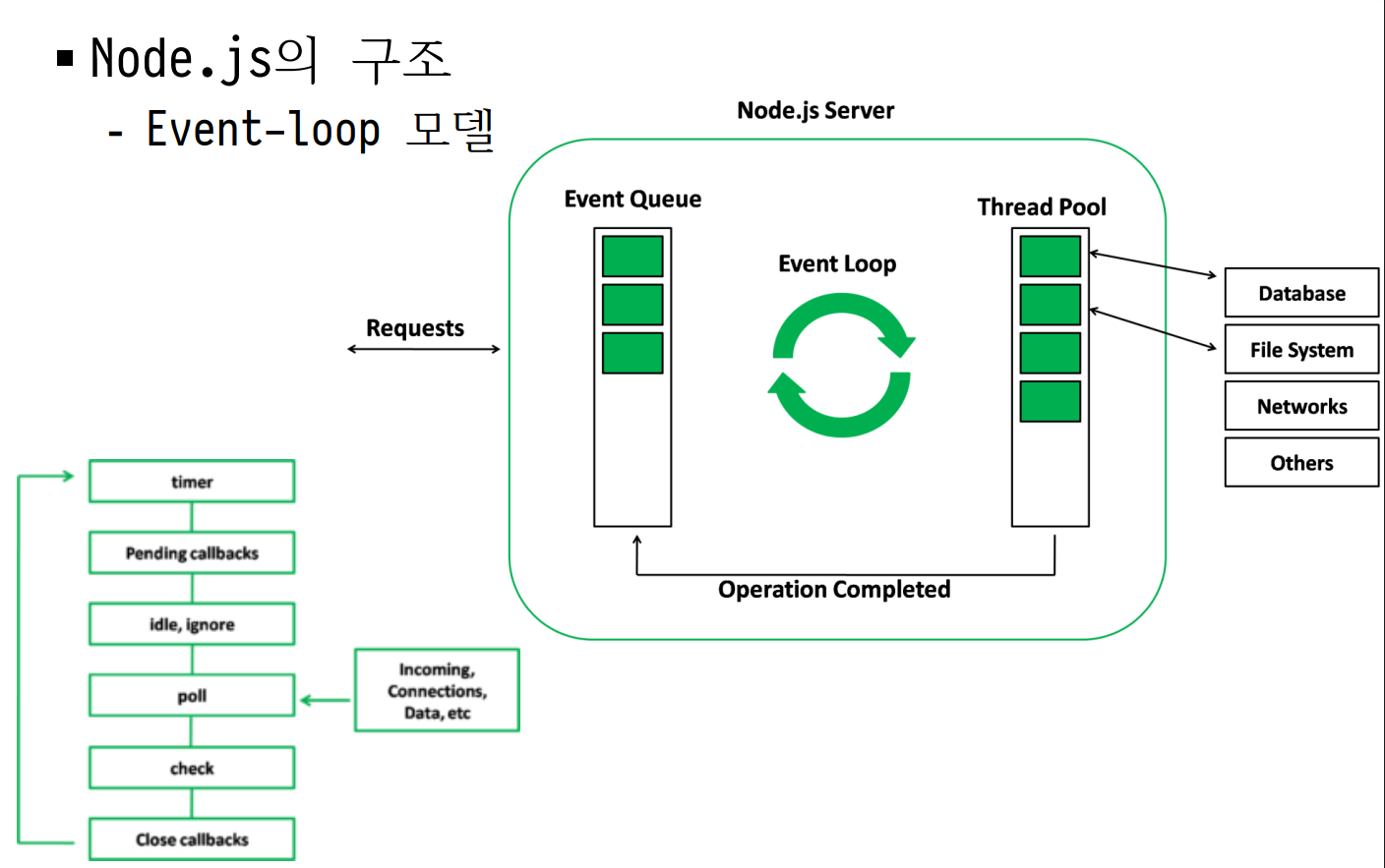 - 요청이 들어오면 이벤트 루프가 콜백을 등록하고, 비동기 작업(예: 파일 읽기, 네트워크 요청)이 끝나면 다시 실행됨.