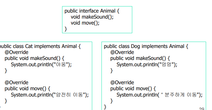 - 인터페이스 클래스는 다른 클래스 생성의 규약으로 사용됨