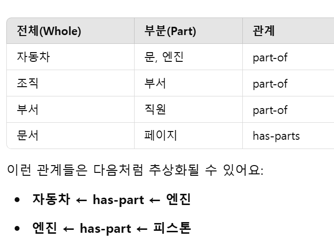 - 예를 들어, 문은 자동차의 a-part-of이고, 직원은 부서의 a-part-of이며, 부서는 조직의 a-part-of이다.