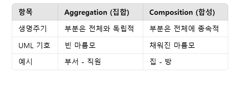 - 하나 이상의 클래스가 모여 새로운 클래스를 형성할 경우에 표 현함