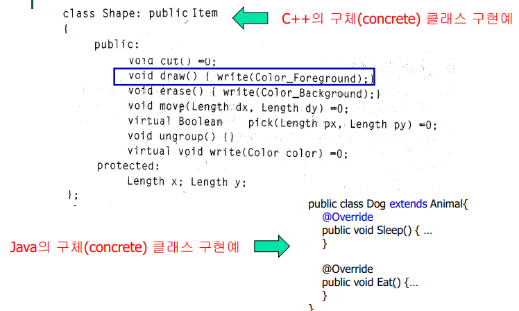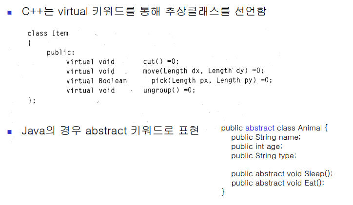 - 주로 공통된 속성과 연산을 정의하지만, 일부 기능은 하위 클래스에서 구현하도록 강제함