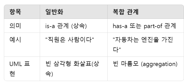 예: 직원은 사람의 일종이다 → Employee is a kind of Person - 공통 속성과 연산을 슈퍼클래스로 추출