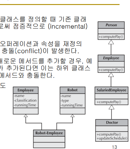 - 상속의 단점: 슈퍼클래스의 오퍼레이션과 속성을 재정의 (redefinition)하는 과정에서 충돌(conflict)이 발생한다.