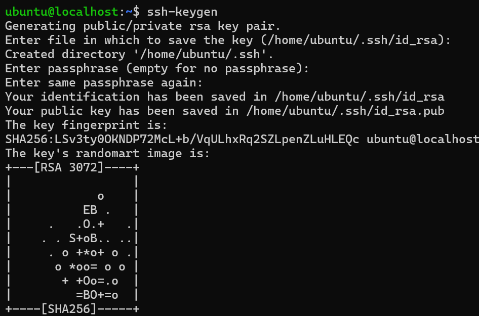 - 기본 경로(~/.ssh/id_rsa, ~/.ssh/id_rsa.pub)에 생성됨
