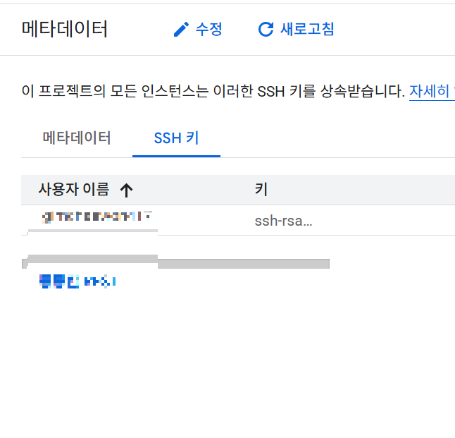 - 메타데이터에 접속하여 SSH 키로 들어간 후 Google 계정 ID로 변경 후 저장