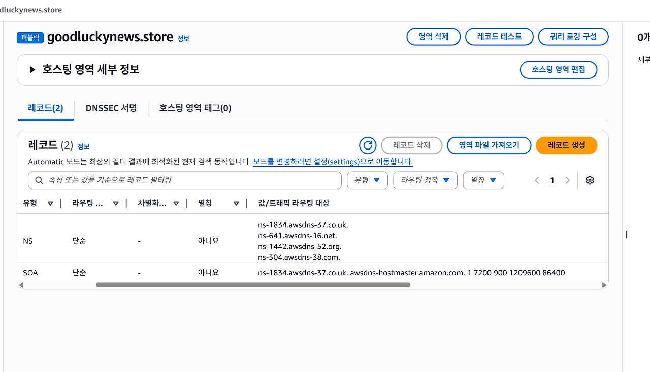 호스팅 영역 생성 결과는 다음과 같습니다.