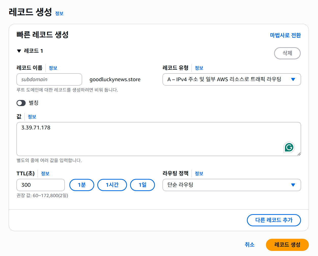 값엔 EC2에서 생성한 고정 ip주소값을 넣으면 됩니다.
