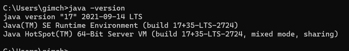 - C:\Program Files\AdoptOpenJDK\jdk-17.0.1.12-hotspot\bin 또는 C:\Program Files\Java\jdk-17\bin.