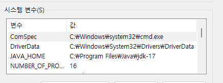 - 변수 값: Java가 설치된 디렉토리 경로 (예: C:\Program Files\AdoptOpenJDK\jdk-17.0.1.12-hotspot 또는 C:\Program Files\Java\jdk-17).