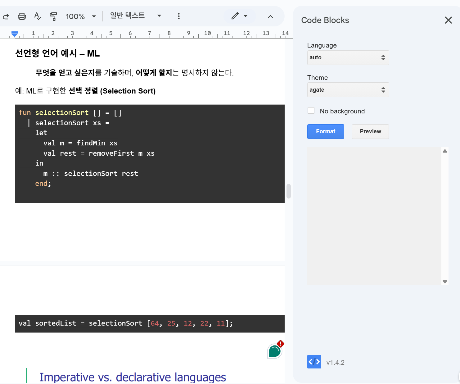 - Format 을 누르면 선택한 코드 블럭이 자동으로 하이라이팅 처리됩니다.