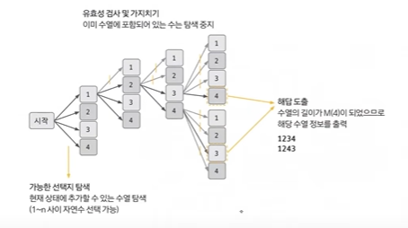 - 현재 수열에서 추가할 수 있는 자연수를 탐색, 자연수가 기존 수열에서 이미 사용한 수라면 해당 수를 선택한 탐색은 진행하지 않고 이전 단계로 돌아간다(가지지치기)