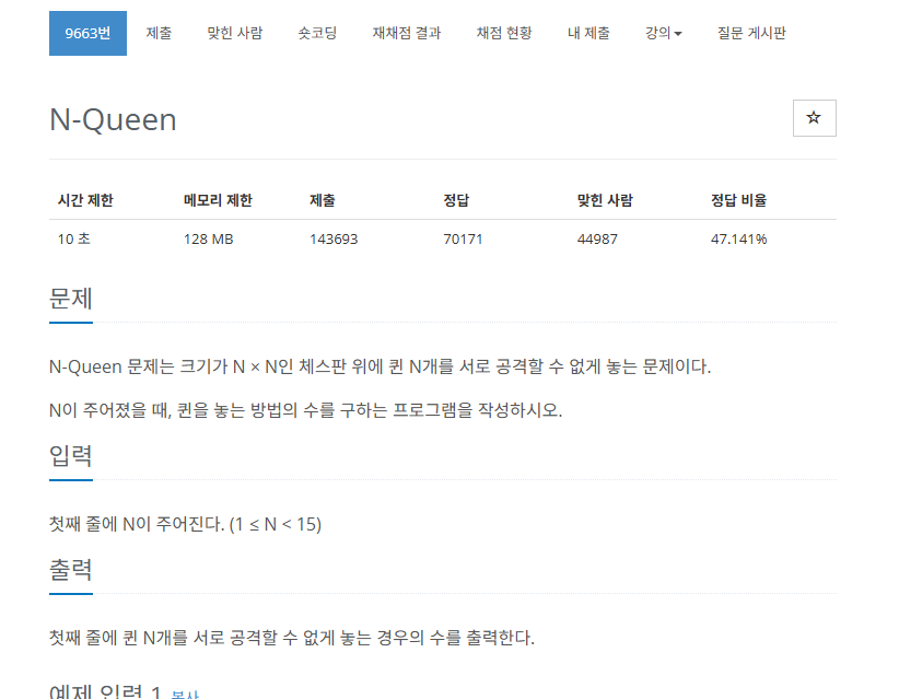 - 맨 위 행부터 시작해 각 행마다 퀸을 하나 씩 배치하며 가능한 모든 경우의 수를 찾는 방식