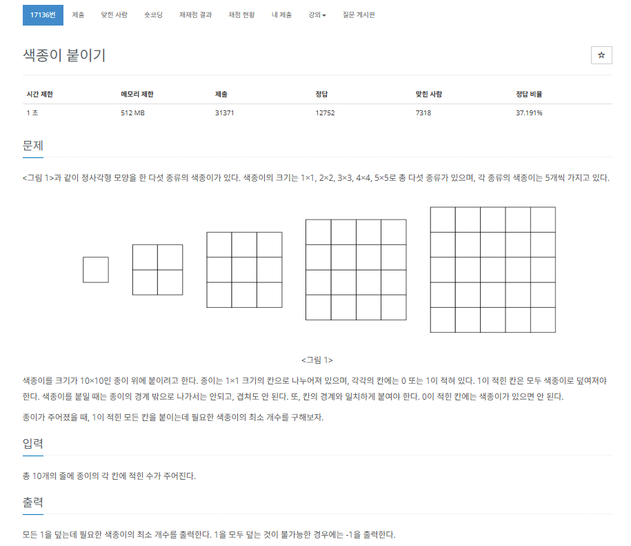 1이 있는 칸에만 색종이를 붙여야 하고 칸에 딱 맞게 붙여야 하는 것. 각 종류의 색종이를 5개씩 가지고 있기 때문에 한 종류 마다 5개까지 사용할 수 있다. 즉 전체 색종이 개수는 25개이다.