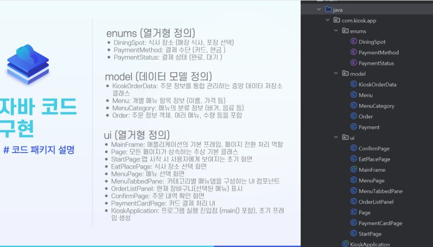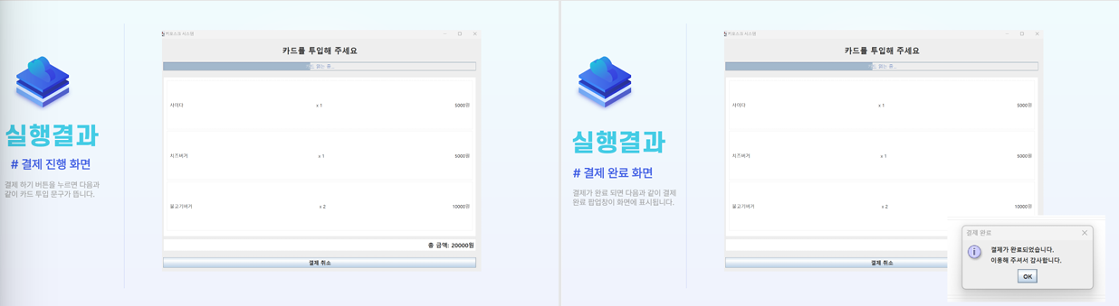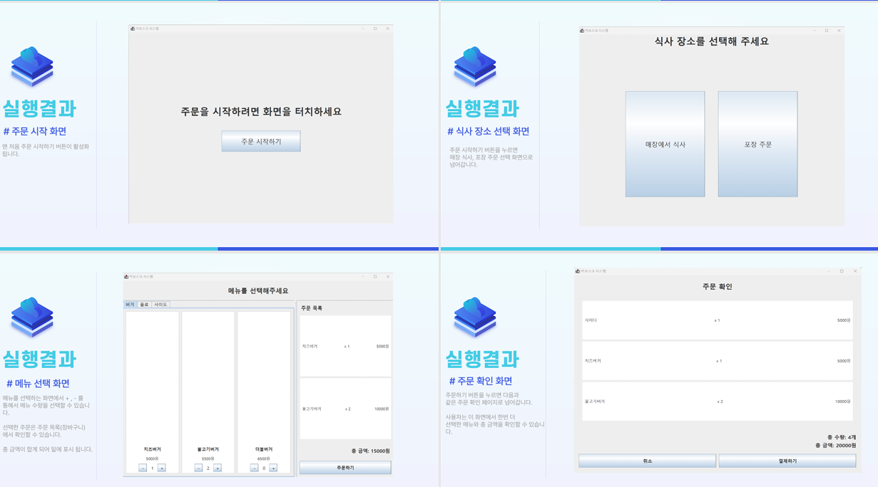 본 프로젝트는 소프트웨어 분석 및 설계 교과목에서 진행한 키오스크 시스템 구현 프로젝트입니다. 요구사항 분석부터 설계, 구현까지 해보면서 실제 서비스 환경에서 활용 가능한 키오스크 애플리케이션을 개발하는 것을 목표로 하였습니다.