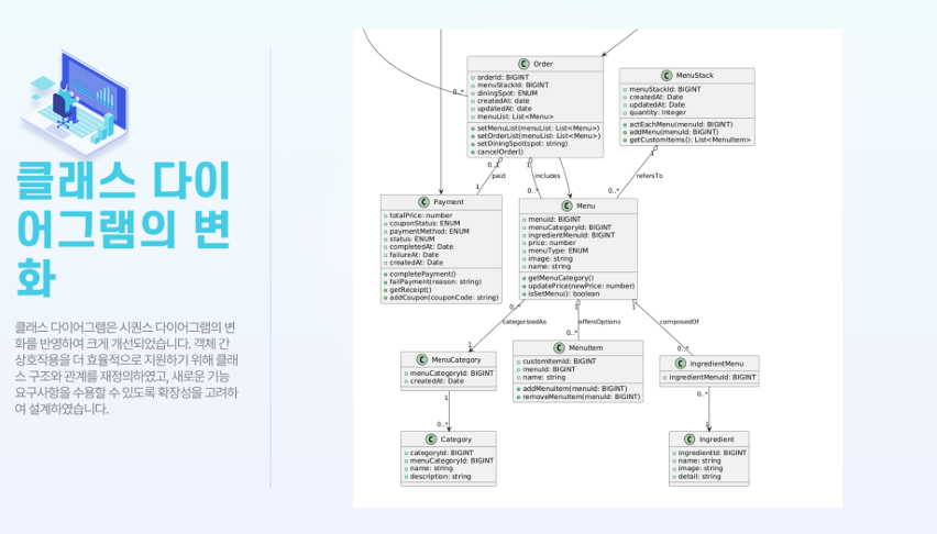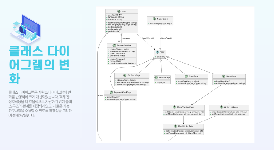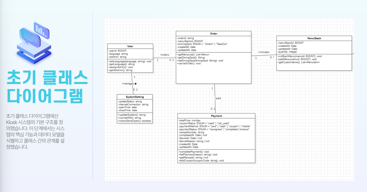초기 클래스 다이어그램에선 Kiosk 시스템의 기본 구조를 정의했습니다. 이 단계에서는 시스템의 핵심 기능과 데이터 모델을 식별하고 클래스 간의 관계를 설정했습니다.