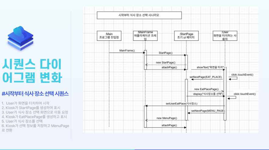 수정된 시퀀스 다이어그램에선 시작부터 식사 장소 선택 시퀀스와 메뉴 선택 시퀀스를 생각하는 방향으로 진행했습니다.