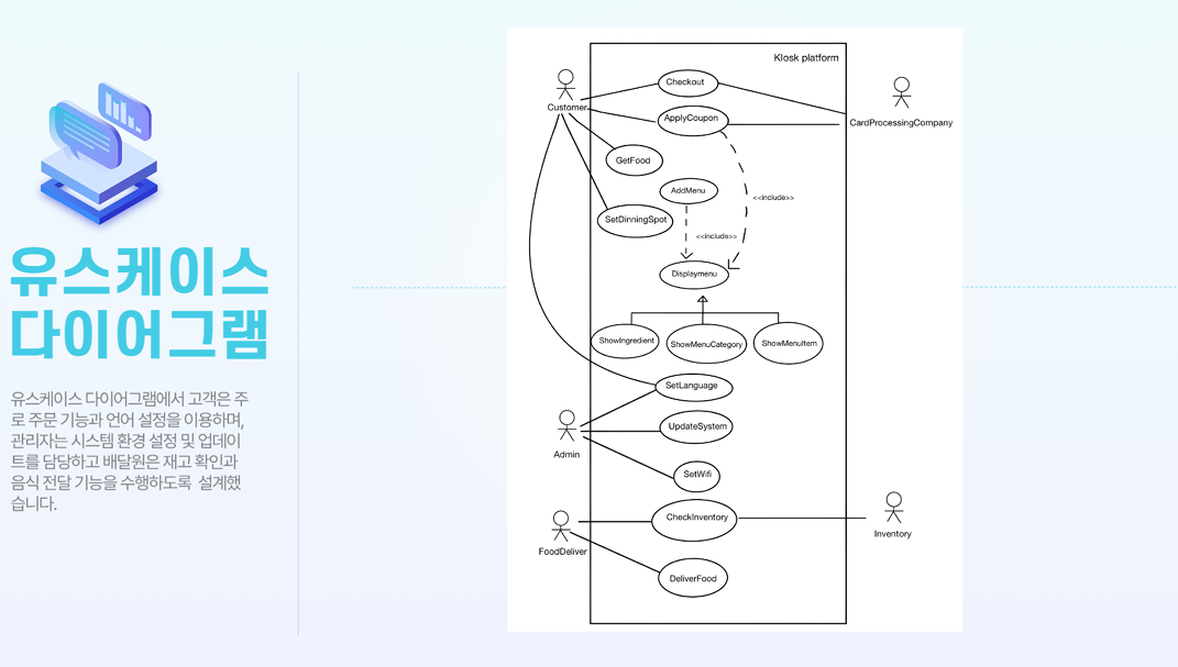 유스케이스 다이어그램에서 고객은 주로 주문 기능과 언어 설정을 이용하며, 관리자는 시스템 환경 설정 및 업데이트를 담당하고 배달원은 재고 확인과 음식 전달 기능을 수행하도록 설계했습니다.