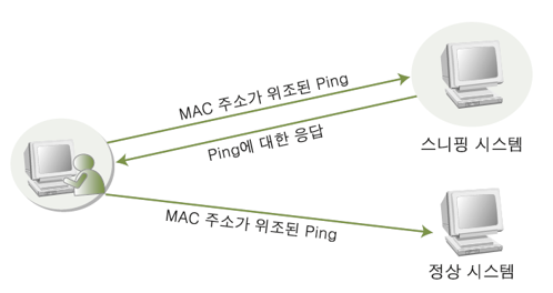 대부분 스니퍼는 일반 TCP/IP에서 동작하기 때문에 request를 받으면 response를 전달한다. 이를 이용하여 의심이 가는 호스트에 ping을 보내면 스니퍼를 탐지한다. 이때 네트워크에 존재하지 않는 MAC 주소를 위장해서 전송한다.