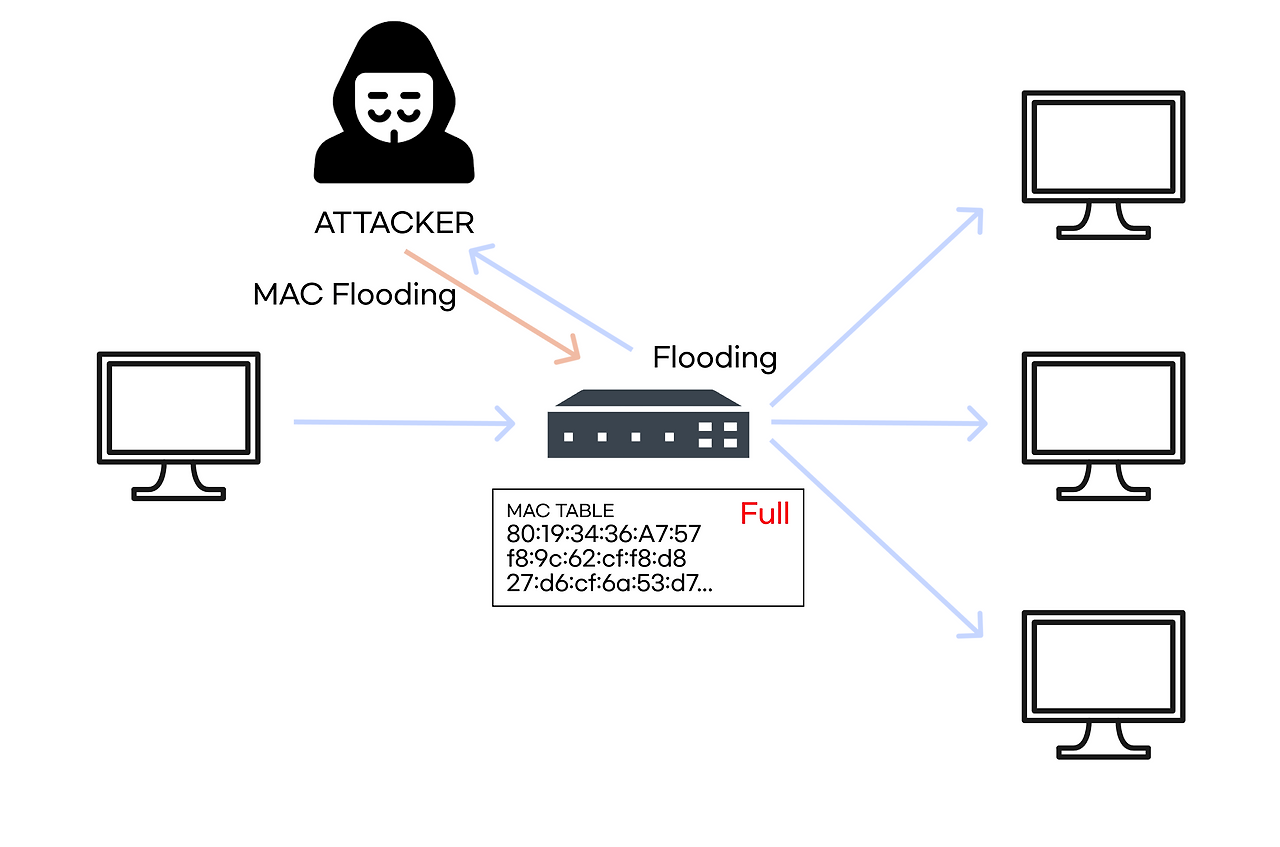 위조된 매체 접근 제어(MAC) 주소를 지속적으로 네트워크로 흘려 보내 스위치 저장 기능을 혼란시켜 더미 허브(dummy hub)처럼 작동토록하는 공격을 말한다. 테이블은 넘치면 스위치는 안전모드 대신 허브처럼(flooding) 동작하여 모든 포트로 프레임을 브로드캐스트하게 되고, 결과적으로 공격자는 다른 포트의 트래픽을 수집(스니핑) 할 수 있게 되는 것이다.
