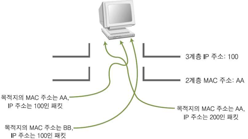 네트워크 카드는 패킷의 IP 주소와 MAC 주소를 인식하고 자신의 버퍼에 저장할지를 결정한다. 이때 인식된 데이터 링크 계층과 네트워크 계층의 정보가 자신의 것과 일치하지 않는 패킷은 무시한다.