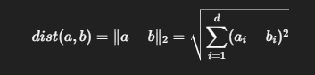 두 점(혹은 샘플) 간의 실제 직선거리(피타고라스 거리) 를 구하는 식이다. 이는 머신러닝에서 KNN, K-means, SVM, PCA 등 거리 기반 알고리즘의 핵심 연산으로 쓰인다.