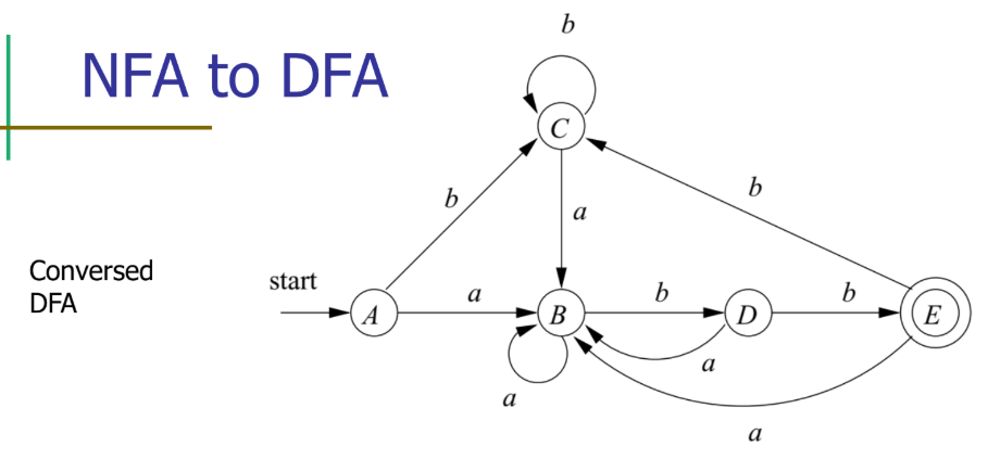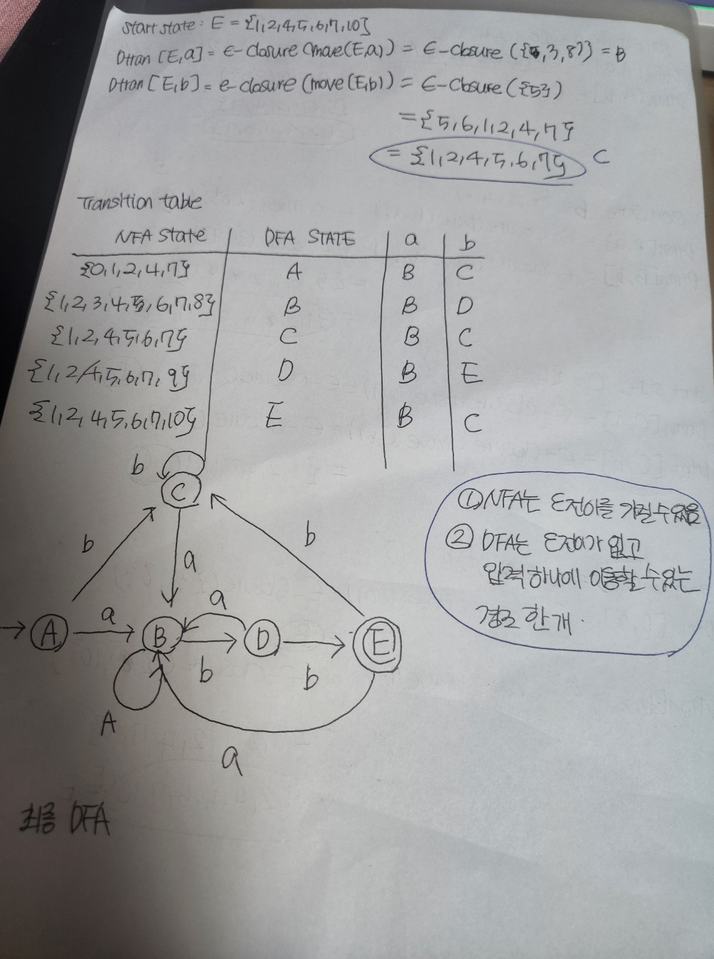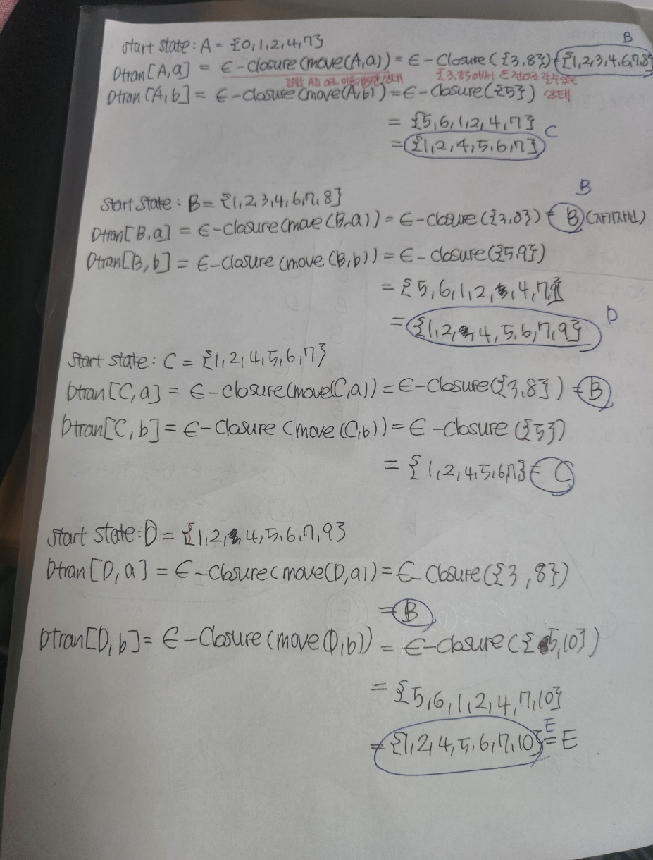 F' = { S in Dstates | S ∩ F ≠ ∅ } # NFA의 종료 상태를 포함하는 집합이면 DFA 종료 상태