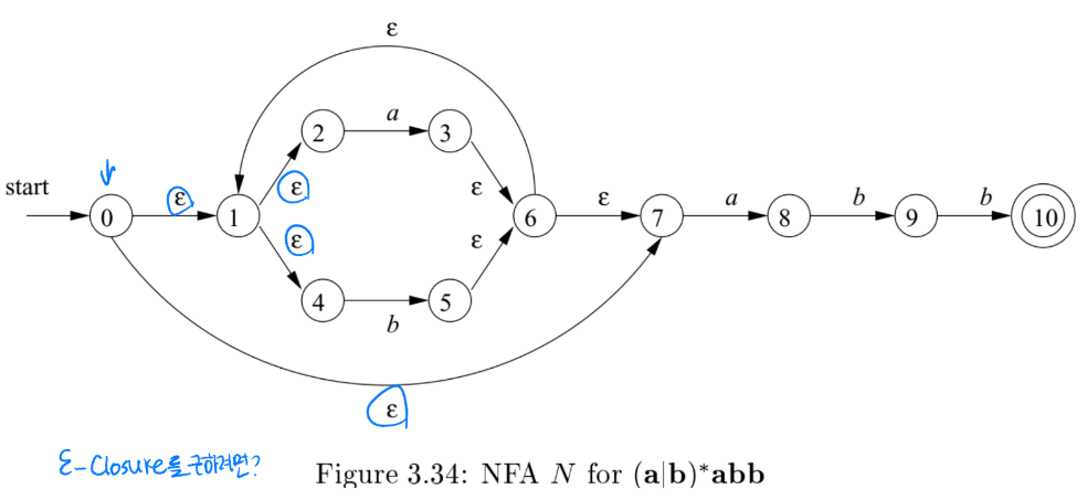NFA에서 DFA로 변환할 때 ε-closure(ε-닫힘)는 어떤 상태에서 ε-transition(ε-이동)을 통해 도달할 수 있는 모든 상태 집합을 의미한다.