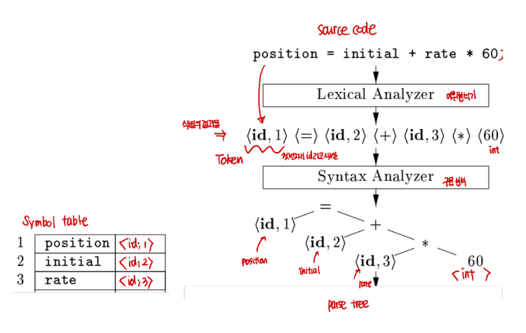 - 각 단어가 어떤 종류인지 분류 (식별자 id, 연산자 op, 숫자 num 등)