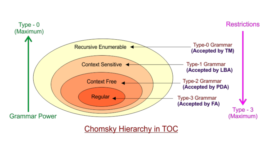 문법을 표현 능력(Grammar Power)과 제약(Restrictions)에 따라 네 가지 계층으로 나눈 구조로, 안쪽에서 바깥쪽으로 갈수록 제약이 줄고, 표현 능력이 강해진다.