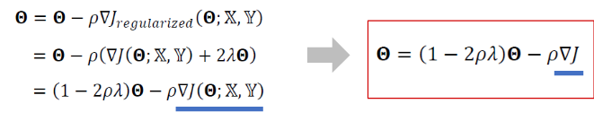 이러한 가중치 감쇠를 고려한 업데이트가 반복 적용되면 결국 최종해를 원점 가까이 당기는 효과가 난다.