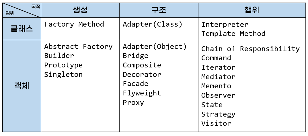 - 행위: Chain of Responsibility, Iterator, Command, Interpreter, Memento, Observer, State, Strategy, Visitory, Template Method, Mediator
