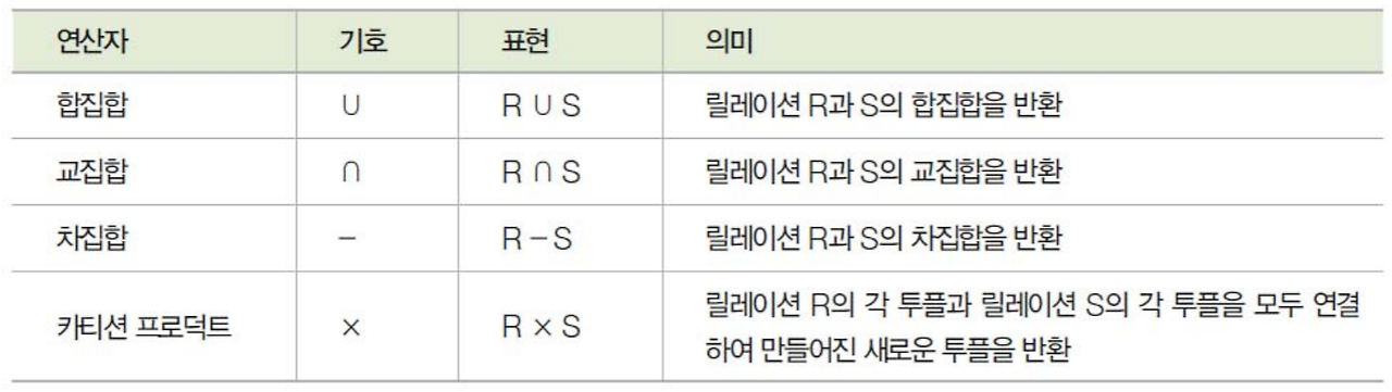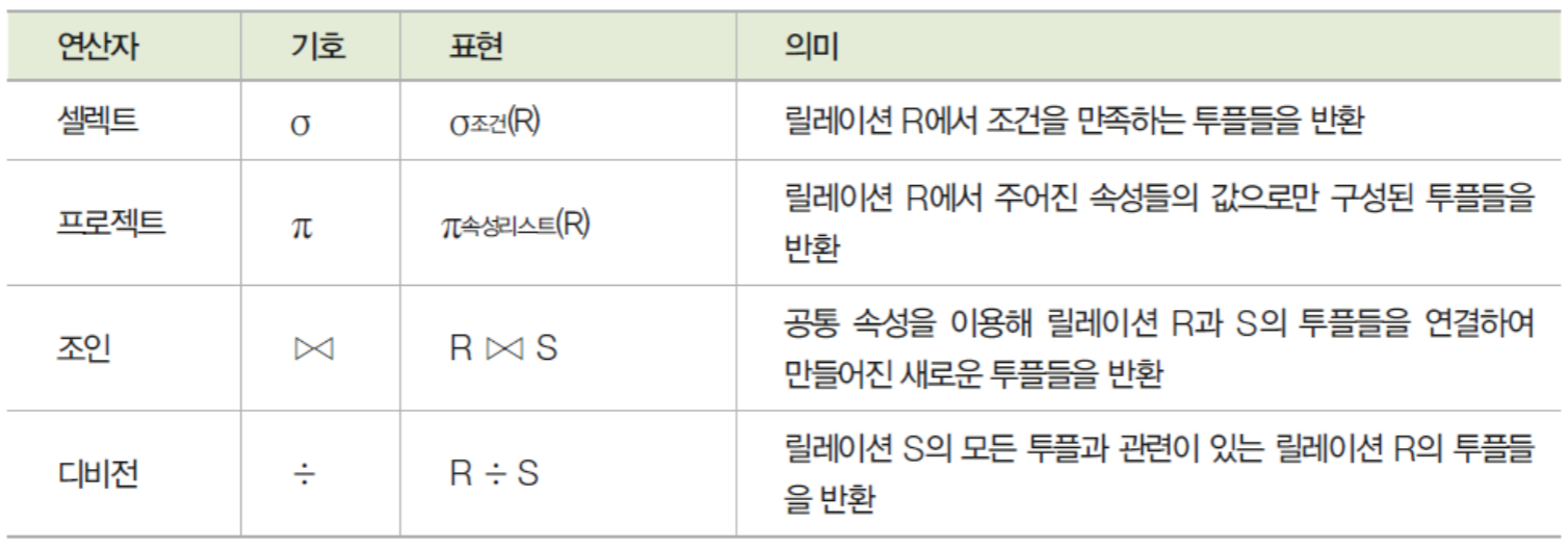 - 주어진 릴레이션 조작을 위한 연산의 집합