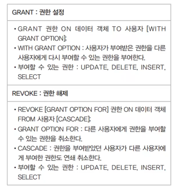 - DCL의 종류 : GRANT, REVOKE, COMMIT, ROLLBACK