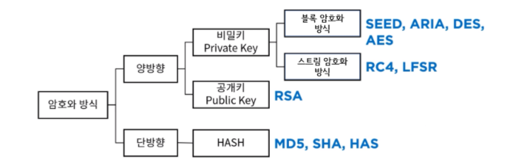 - 종류 : DES, AES, ARIA, SEED, IDEA, RC4