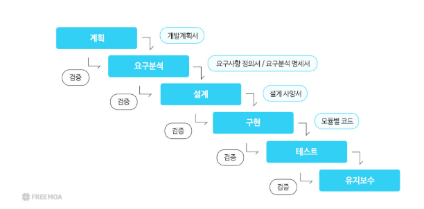 - 각 단계가 끝나는 시점에서 확인, 검증, 검사를 거쳐 다음 단계로 넘어가거나 이전 단계로 환원하면서 구현 및 운영 단계에 이르는 하향식 생명주기 모형이다