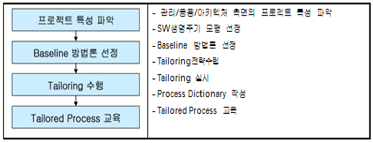 - 기존 개발 방법론의 절차, 기법, 산출물 등을 프로젝트 상황에 맞게 수정하는 작업으로 개발 프로세스를 최적화한다
